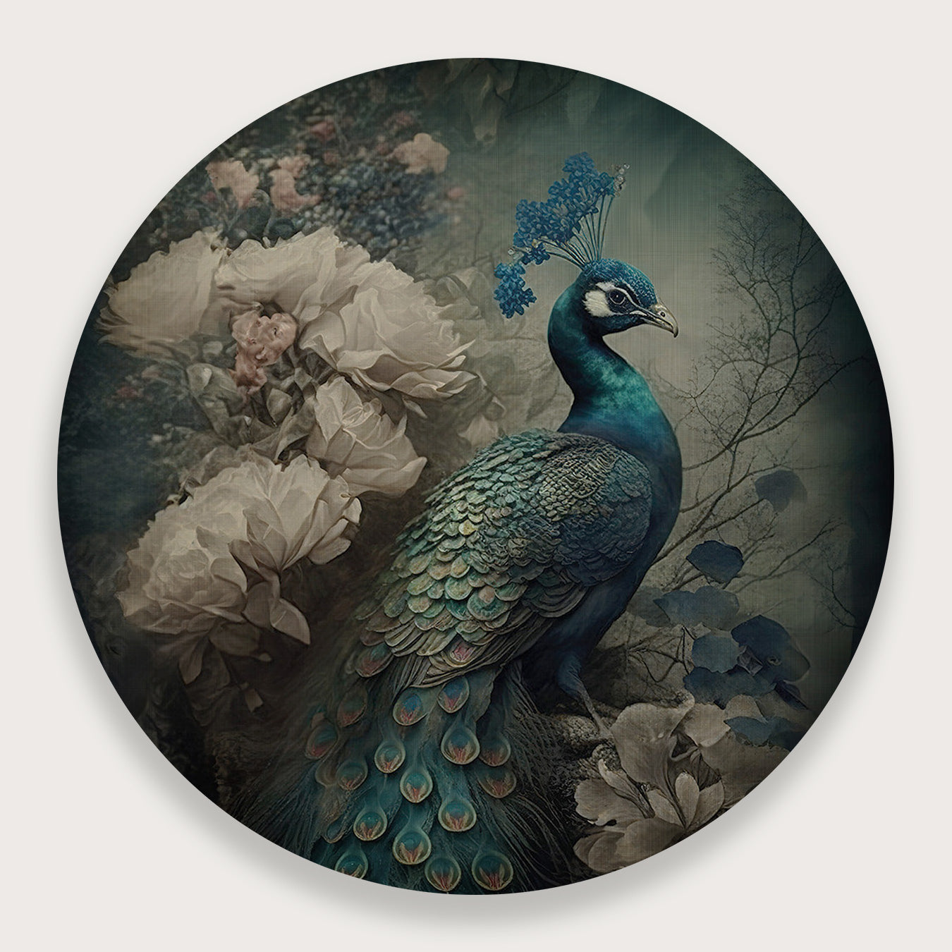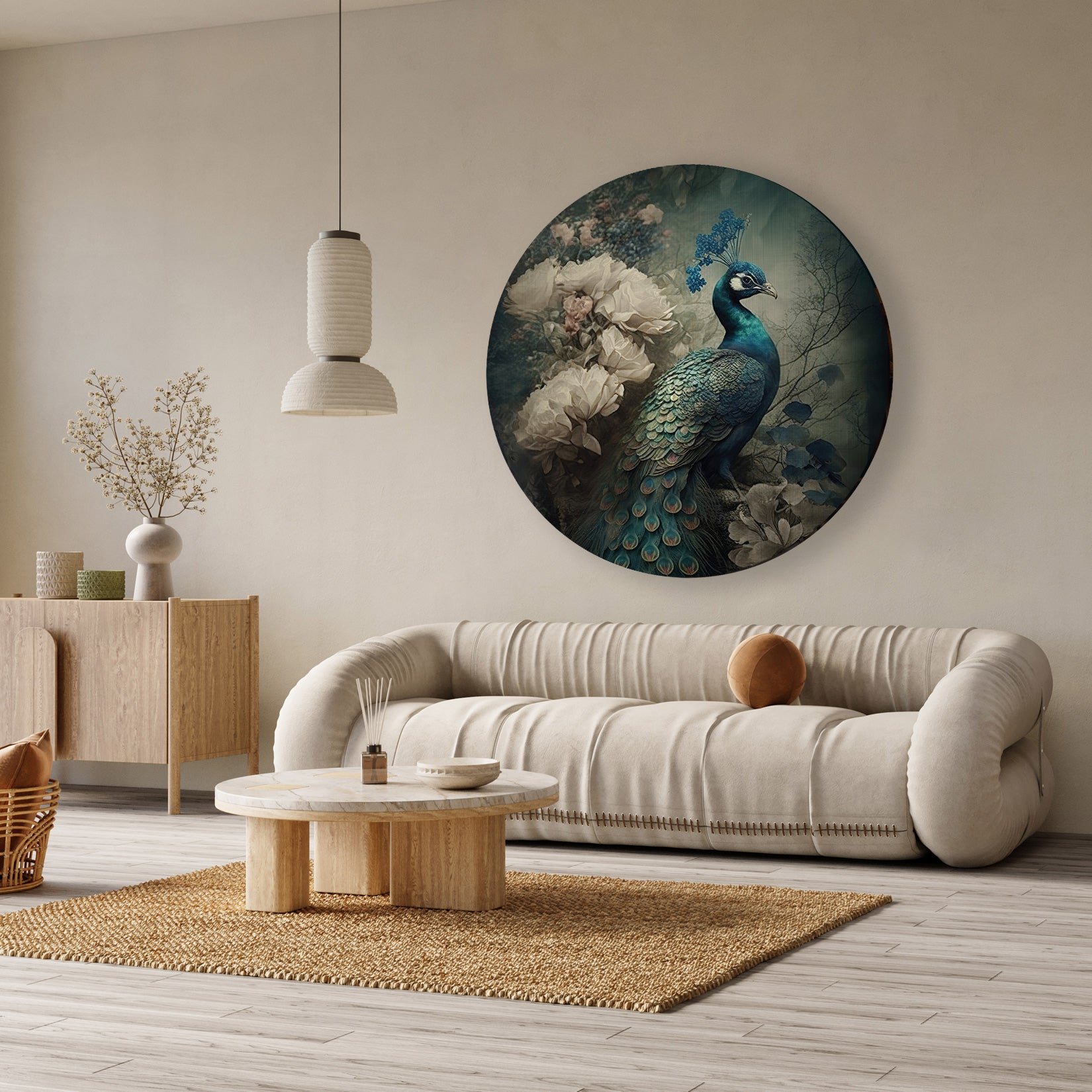 Deze muurcirkel van aluminium dibond toont een indrukwekkende pauw in een sfeervolle, bijna dromerige omgeving. Het ontwerp straalt elegantie en rust uit, waardoor het een verfijnde toevoeging is aan jouw interieur. Door de subtiele kleuren en gedetailleerde weergave komt dit kunstwerk prachtig tot zijn recht in een woonkamer, slaapkamer of een stijlvol kantoor. Het brengt een natuurlijke, serene sfeer en zorgt voor een fraaie blikvanger aan de muur.