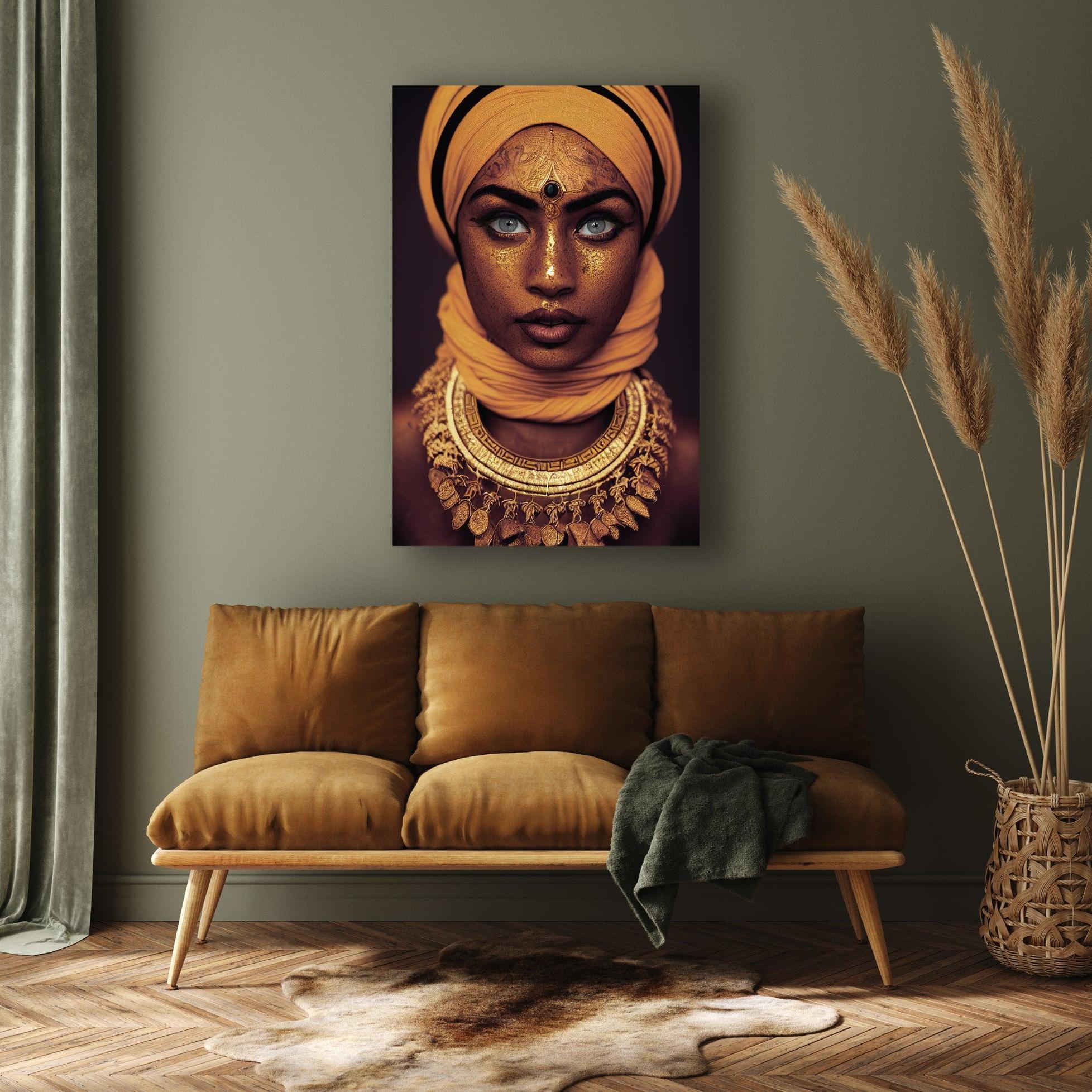 Deze stijlvolle wanddecoratie voegt sfeer en elegantie toe aan de woonkamer, slaapkamer of werkplek. De warme kleuren zorgen voor een krachtig maar ontspannen visueel effect, dat perfect aansluit bij moderne woonstijlen zoals hotel chique, scandinavisch en minimalistisch. Het portret geeft je interieur een uniek ontwerp en een persoonlijk karakter, waardoor het een stijlvol muuraccent wordt dat opvalt zonder te overheersen.