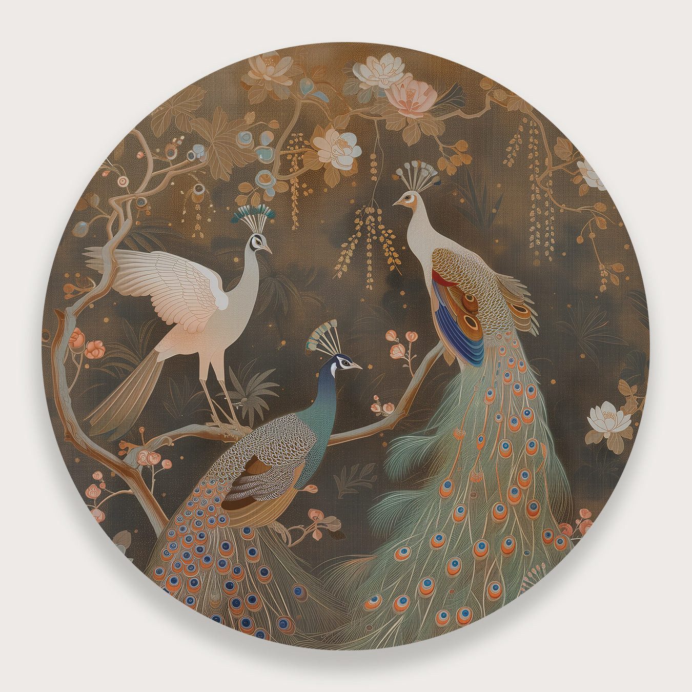Deze muurcirkel van aluminium dibond met het ontwerp van Asian Peacocks 2 brengt een elegante en rustgevende sfeer in jouw interieur. De subtiele kleurencombinatie van aardetinten en zachte pastels maakt het kunstwerk een stijlvolle blikvanger in bijvoorbeeld de woonkamer, slaapkamer of hal. Door het gedetailleerde ontwerp van de pauwen krijgt de ruimte een natuurlijke en verfijnde uitstraling die zowel klassiek als modern aanvoelt.