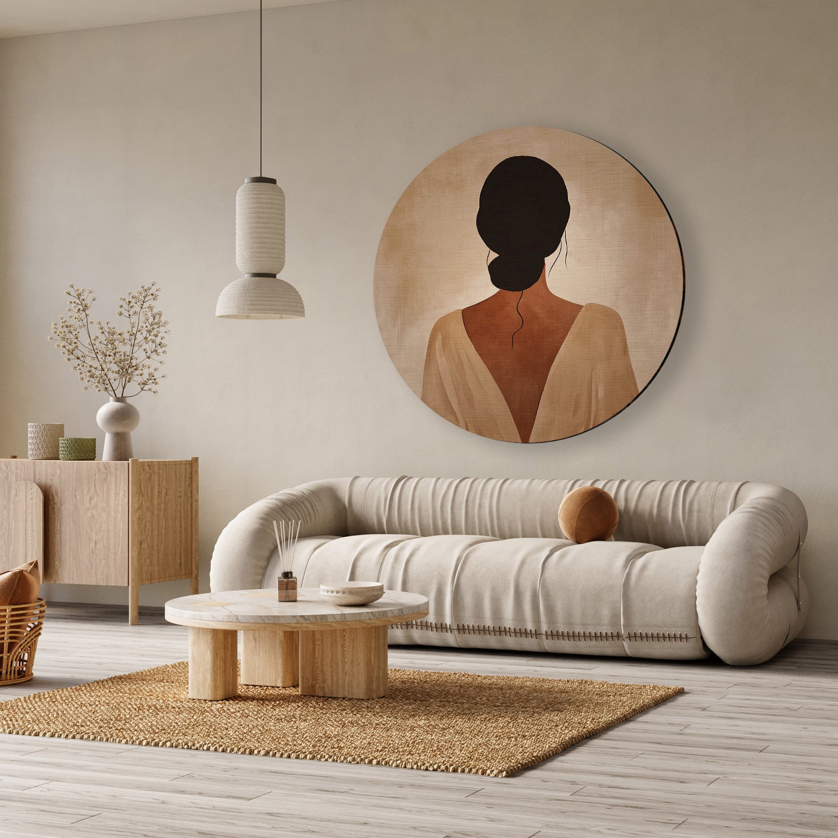 De muurcirkel Celia · Aluminium brengt een warme, elegante sfeer in elke ruimte. Het ontwerp toont een stijlvolle silhouet van een vrouw met een rustige, natuurlijke uitstraling, perfect voor een moderne en sfeervolle inrichting. Deze aluminium wanddecoratie voegt diepte en karakter toe aan bijvoorbeeld de woonkamer, slaapkamer of hal, en zorgt direct voor een verfijnde en serene ambiance.