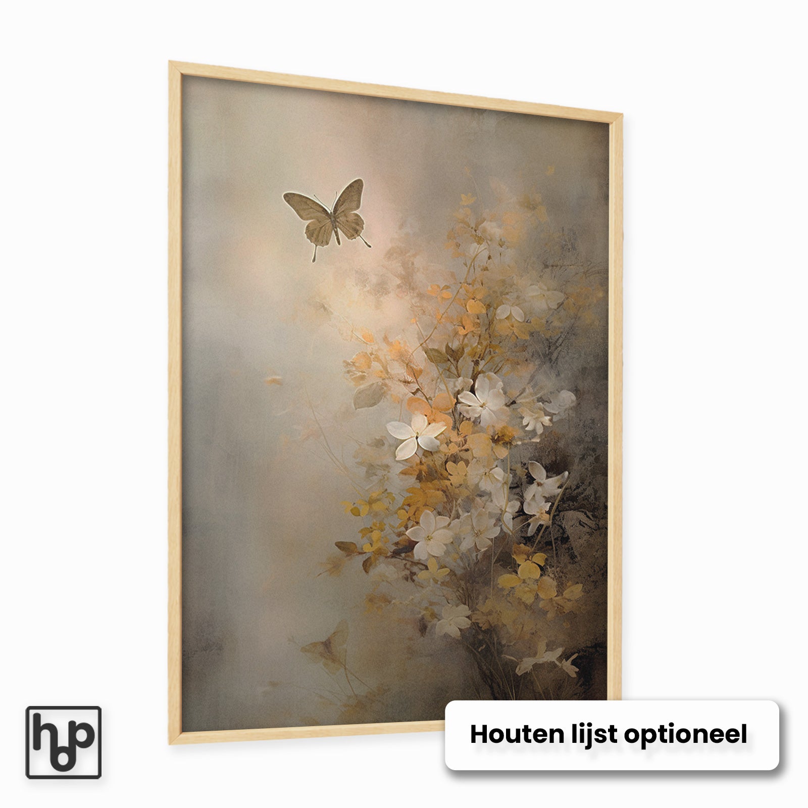 Deze designposter straalt een verfijnde vintage charme uit met zachte, natuurlijke kleuren en een speels vlinderdetail. Het elegante kunstwerk brengt een fris en sfeervol muuraccent in de woonkamer, slaapkamer of werkplek en geeft daarmee iedere ruimte een kalme en uitnodigende uitstraling. Flowers 7 past perfect bij woonstijlen zoals landelijk, zen/japandi en Scandinavisch, waar rust en eenvoud centraal staan. Als wanddecoratie of muurkunst is deze staande poster een tijdloos en uniek ontwerp dat je interieur direct verrijkt.