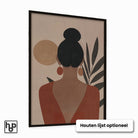 Dit unieke ontwerp toont een vrouw met haar rug naar je toe, omhuld in warme aardse kleuren en zachte zonlichtaccenten. Het brengt een perfect evenwicht tussen kracht en ontspanning, wat zorgt voor een sfeervol wanddecoratie-element in woonkamer, slaapkamer of werkplek. Dankzij het subtiele contrast en de tropische, abstracte bladeren past deze designposter mooi binnen boho, minimalistische en moderne interieurstijlen. Als stijlvol muuraccent voegt het diepte en karakter toe zonder te overheersen.