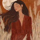 Met haar serene afbeelding van een vrouw omringd door maan, zon en siergrassen voegt dit wandkleed een sfeervol en warm element toe aan je woonkamer, slaapkamer of werkplek. Kies zelf voor Mezo, een robuuste matte stof met een natuurlijke uitstraling, of Velours, een luxe stof met subtiele zijdeglans. Dit stijlvolle muuraccent past perfect in woonstijlen zoals bohemian, zen/japandi/minimalistisch en industrieel. De rijke, warme kleuren en het unieke ontwerp zorgen voor een sfeervol kunstwerk dat karakter en diepte in je interieur brengt.