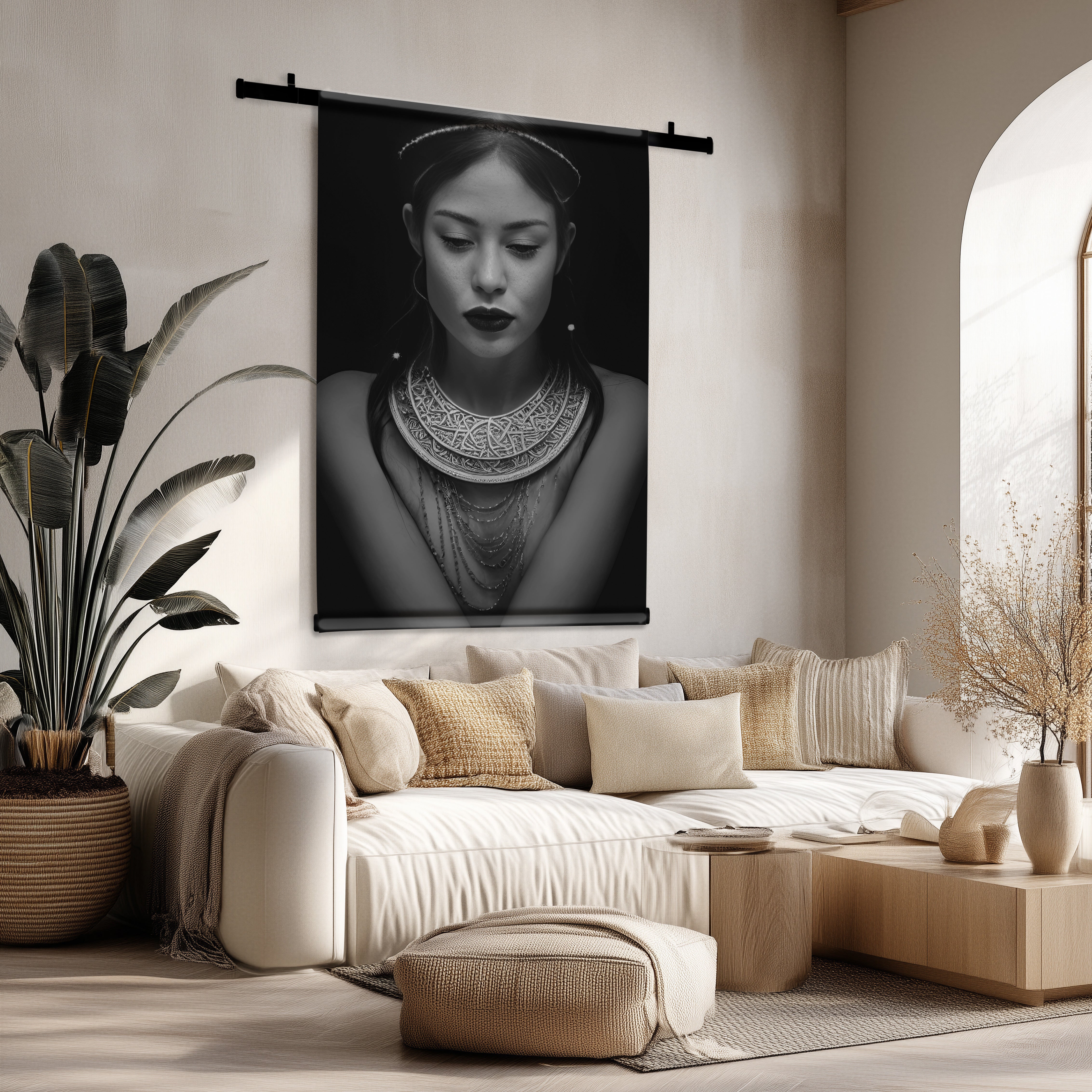 Ervaar de kracht van een expressief portret dat sfeer en mystiek brengt in elke ruimte. Dit wandkleed versterkt je interieur met een stijlvolle en karaktervolle uitstraling.