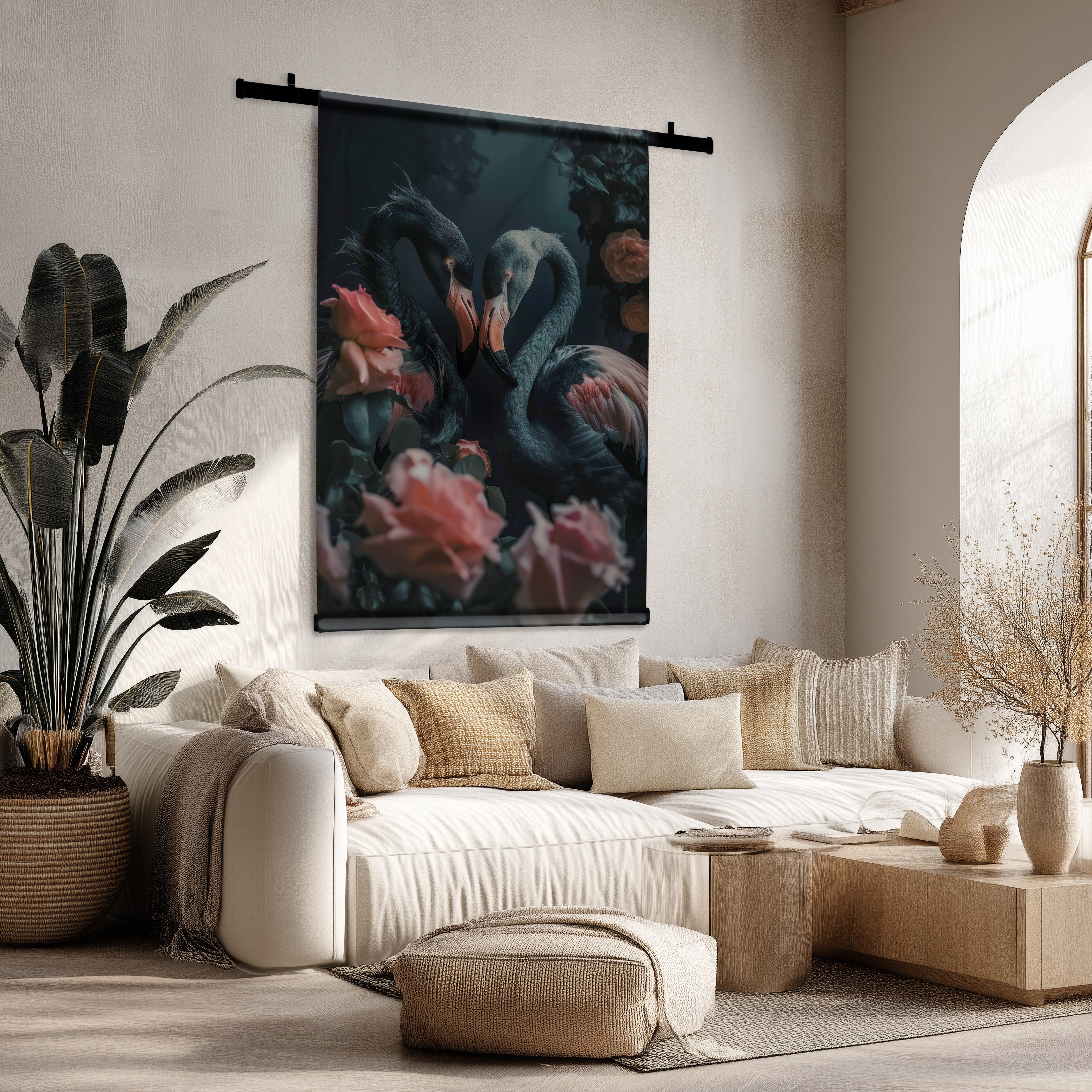 Dit wandkleed is de perfecte muurdecoratie om je woonkamer, slaapkamer of werkplek een unieke uitstraling te geven. Het strakke zwarte ontwerp met flamingo’s zorgt voor een bijzonder visueel effect waarbij het contrast en de textuur rust en karakter toevoegen. Je kiest zelf voor Mezo — een robuuste matte stof met een natuurlijke uitstraling — of Velours, een luxe stof met een subtiele zijdeglans die extra diepte geeft aan het kunstwerk. Dit stijlvolle muuraccent past uitstekend binnen landelijke, hotel chique, minimalistische, bohemian of Scandinavische woonstijlen en tilt je interieur naar een hoger niveau.