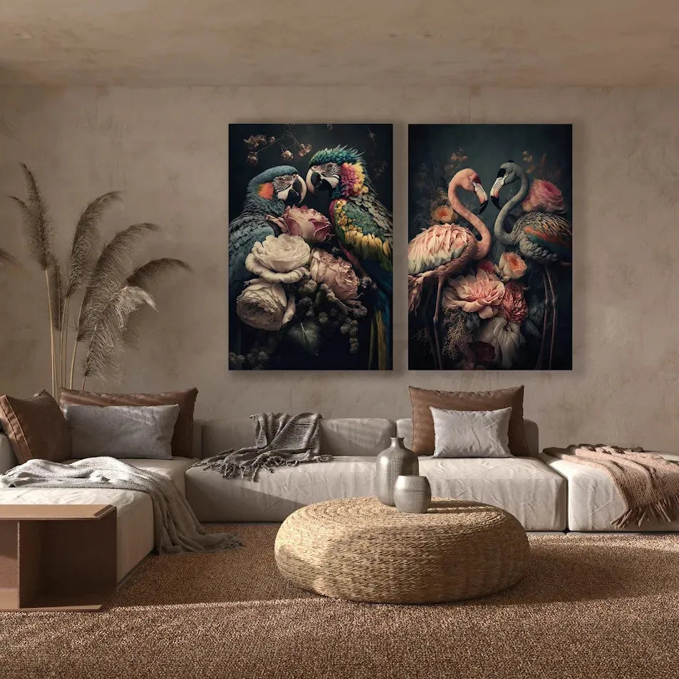 Deze staande poster toont twee sierlijke flamingo’s omringd door weelderige bloemen, waardoor een subtiel contrast ontstaat tussen de zachte vintage tinten en het levendige design. Dit kunstwerk brengt sfeer en karakter in je woonkamer, slaapkamer of werkplek. Dankzij het botanische thema en de natuurlijke kleuren past deze wanddecoratie prachtig binnen woonstijlen als landelijk, scandinavisch en bohemian. Of je nu kiest voor een designposter of stijlvol muuraccent, dit unieke ontwerp geeft je interieur een frisse en sfeervolle uitstraling.