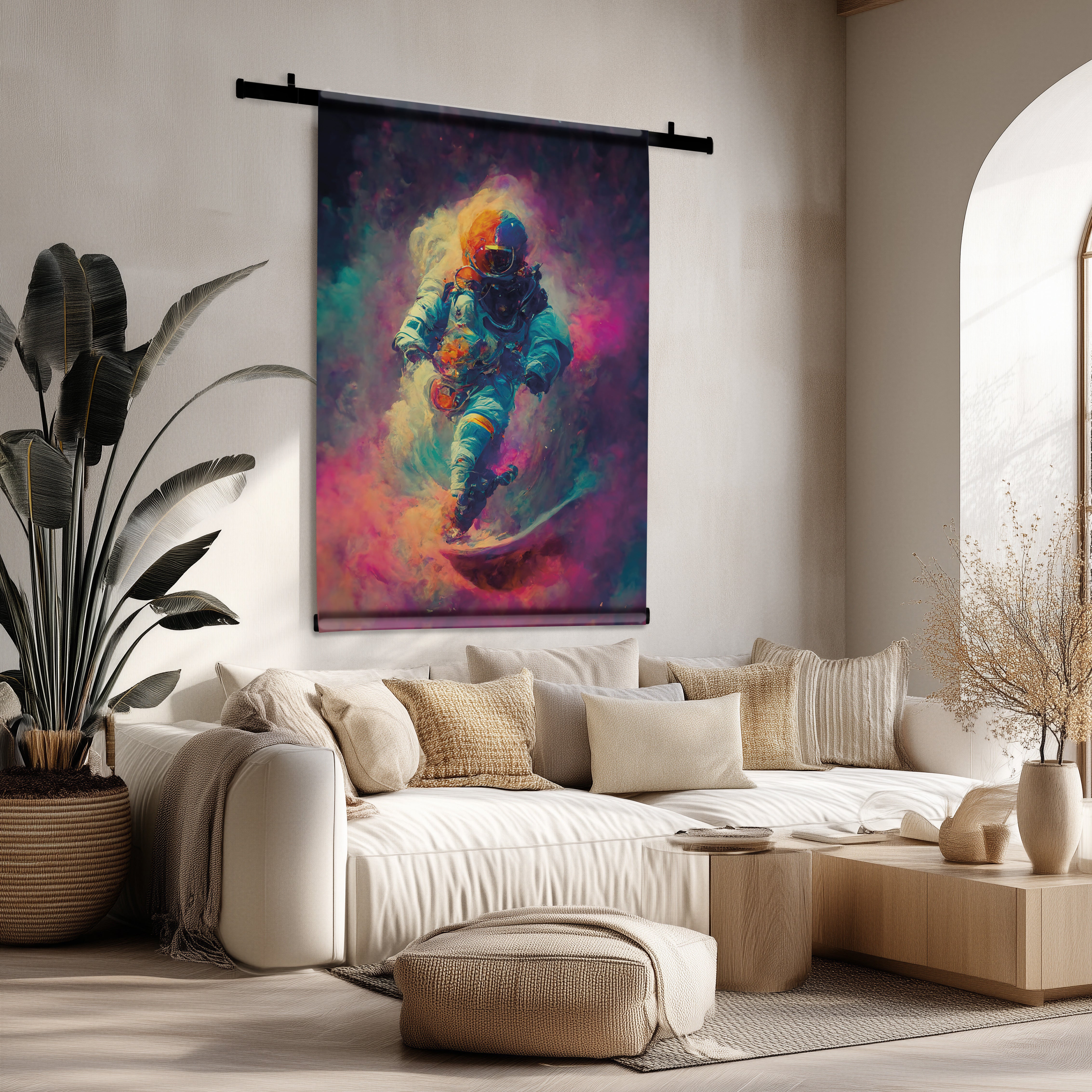 Dit wandkleed voegt meteen leven toe aan je woonkamer, slaapkamer of werkplek dankzij het levendige kleurgebruik en het aansprekende astronautenthema. Het zachte Velours voelt luxe en fluweelzacht aan, wat een warme, uitnodigende sfeer creëert. Je kunt ook kiezen voor de Mezo-stof, die robuust is en een natuurlijke, matte uitstraling heeft. Dankzij het moderne kunstprint ontwerp past deze wanddecoratie perfect in interieurs met een bohemian, industrieel of minimalistisch karakter. Dit stijlvolle muuraccent brengt een unieke mix van avontuur en design in elke ruimte.
