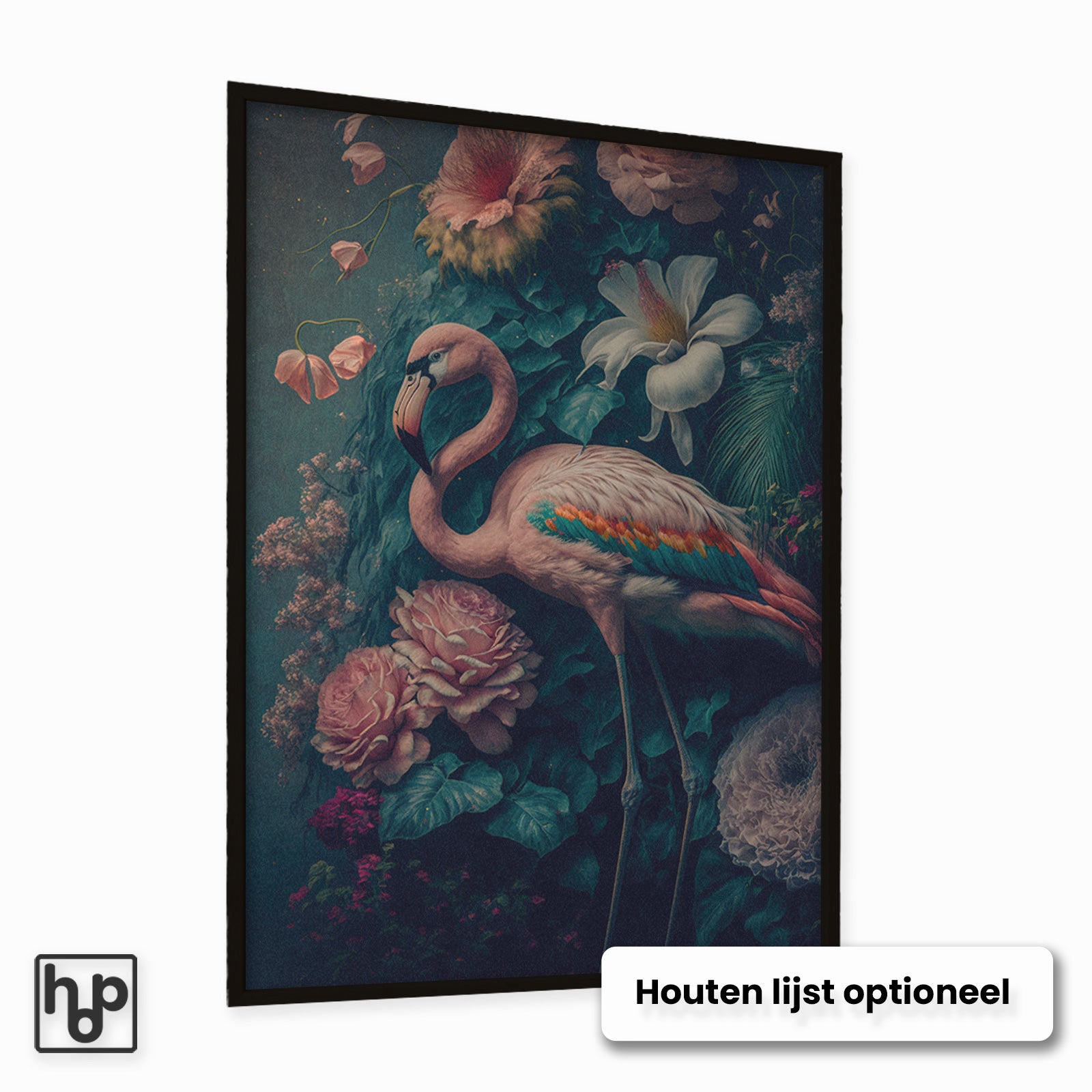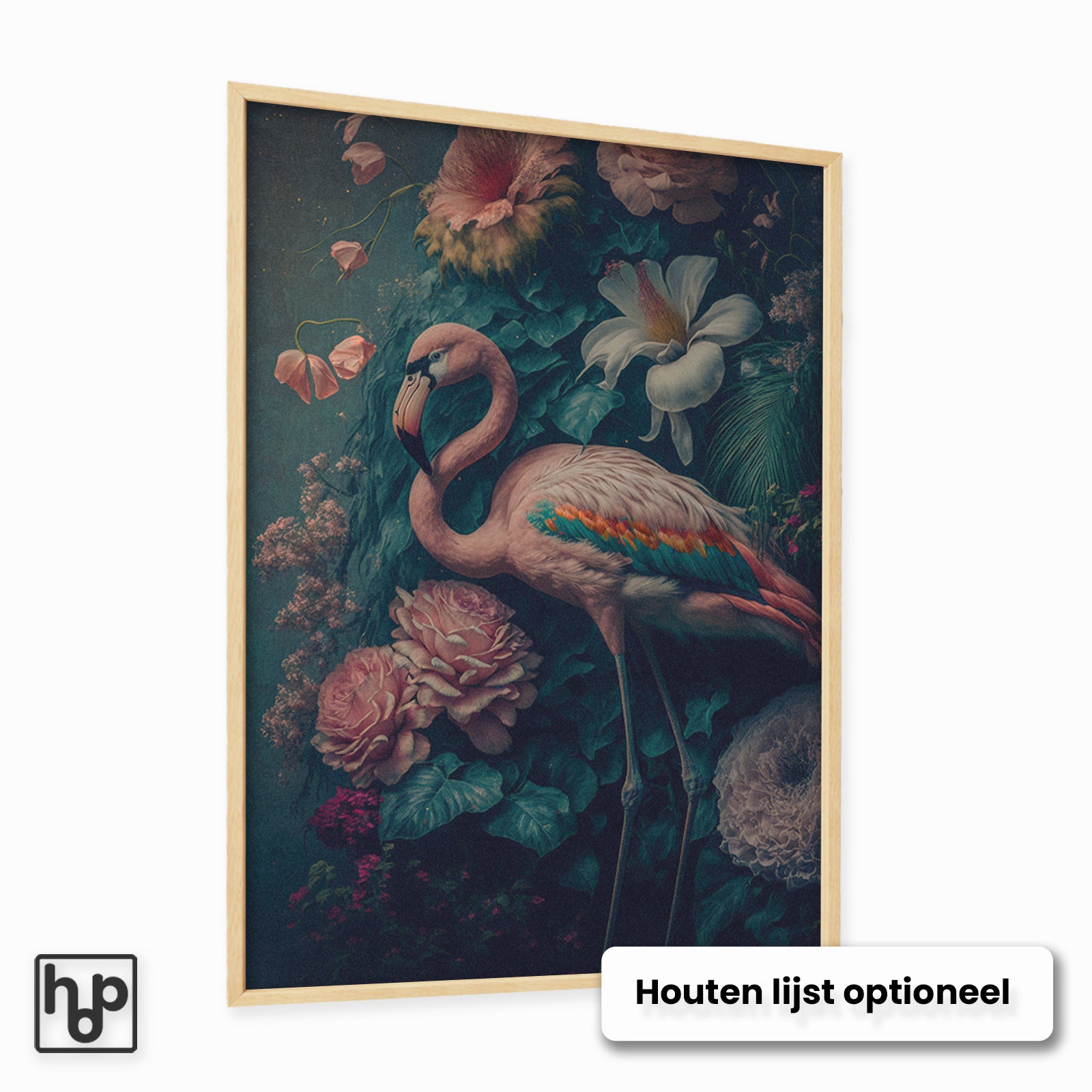Breng een warme, tropische sfeer in huis met deze stijlvolle flamingo poster. Het zachte vintage palet en botanische details versterken iedere ruimte met een ontspannen en elegante uitstraling.