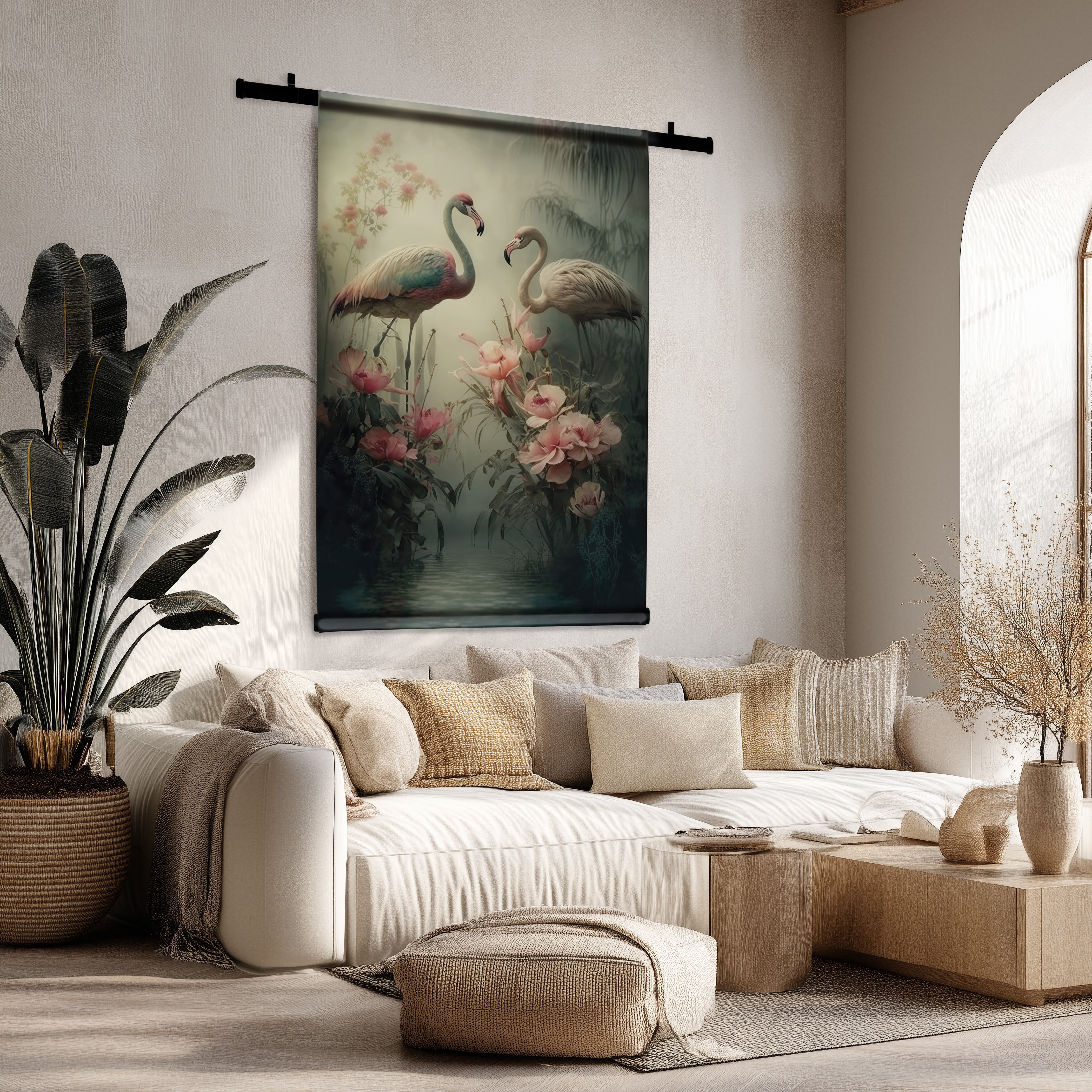 Het wandkleed Flamingo's voegt een natuurlijke en ontspannen sfeer toe aan je woonkamer, slaapkamer of werkplek. De zachte, frisse kleurstelling en het levendige design zorgen voor een visueel aantrekkelijk kunstwerk dat iedere muur verrijkt. Je kiest zelf voor Mezo – een robuuste matte stof met een warme, natuurlijke uitstraling – of Velours, een luxe stof met een subtiele zijdeglans en fluweelzachte structuur. Dit stijlvolle muuraccent past perfect bij woonstijlen zoals landelijk, bohemian, scandinavisch en zen/japandi minimalistisch. Zo geef je jouw interieur een unieke combinatie van rust en karakter.