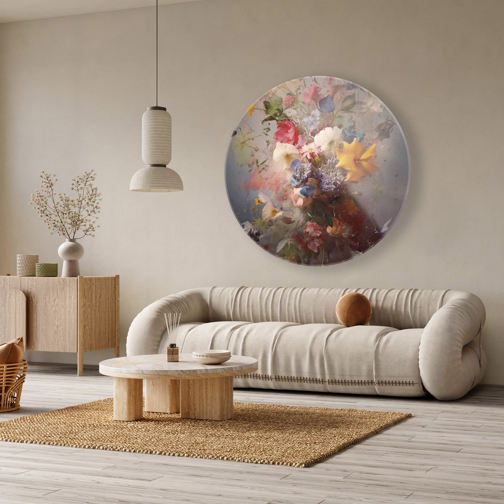 De muurcirkel Floral Blast op plexiglas brengt een explosie van kleuren en bloemen tot leven aan jouw muur. Dit ontwerp combineert zachte pasteltonen met levendige gele en paarse accenten, wat zorgt voor een frisse, natuurlijke sfeer in elke ruimte. De subtiele glans van het plexiglas geeft het kunstwerk een moderne uitstraling waardoor het perfect past in een stijlvol interieur.