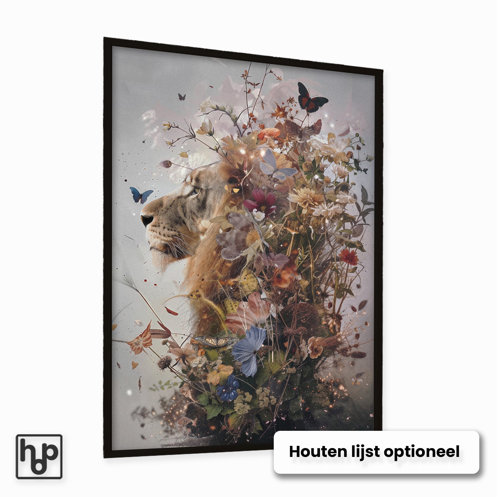 Deze designposter toont een majestueuze leeuw omringd door weelderige bloemen, wat zorgt voor een frisse en natuurlijke uitstraling. De warme kleuren en het fraaie contrast geven rust en energie tegelijk, ideaal voor woonkamer, slaapkamer of werkplek. Dit stijlvolle muuraccent past perfect bij diverse woonstijlen zoals modern, bohemian en scandinavisch, en biedt een sfeervolle wanddecoratie voor liefhebbers van natuur en uniek ontwerp.