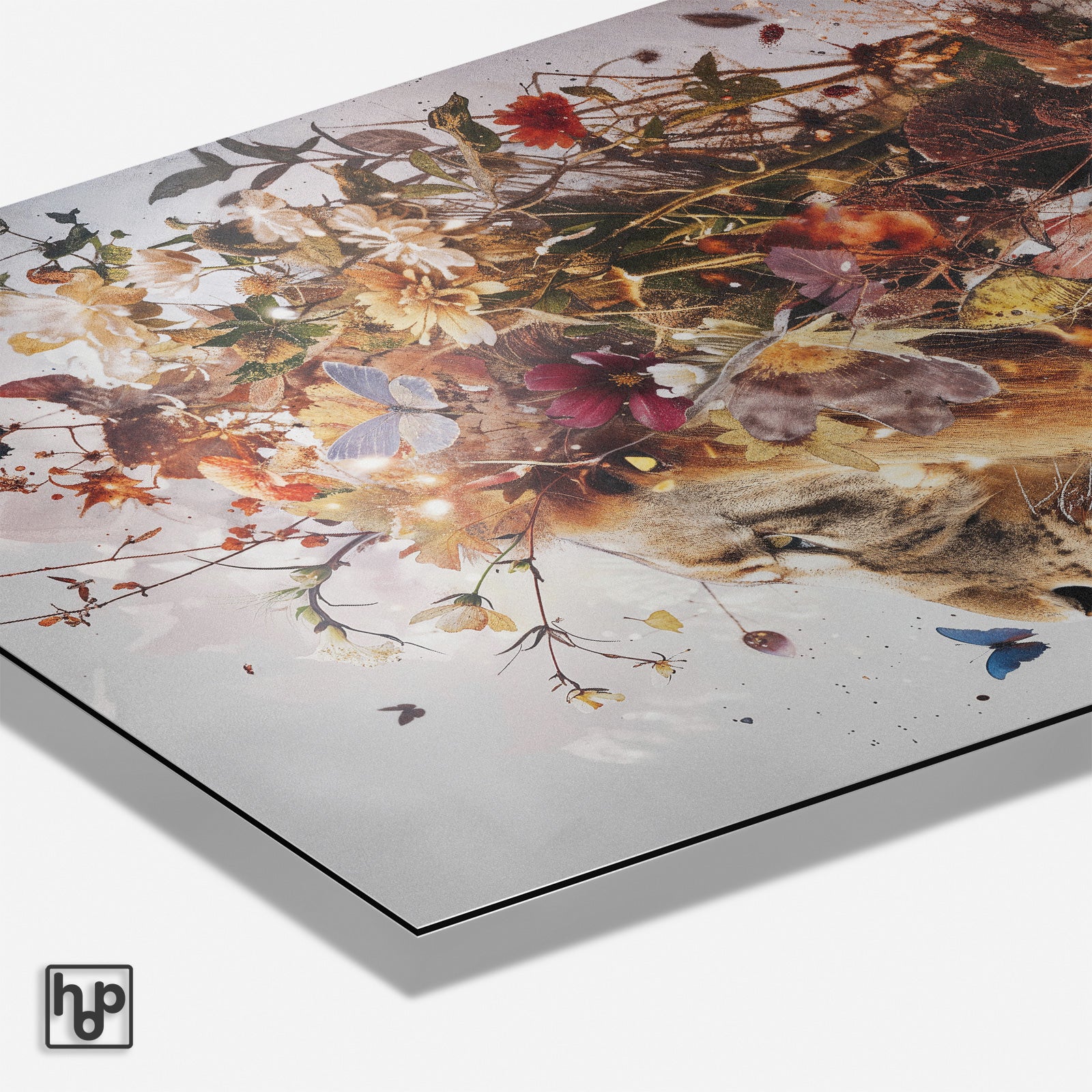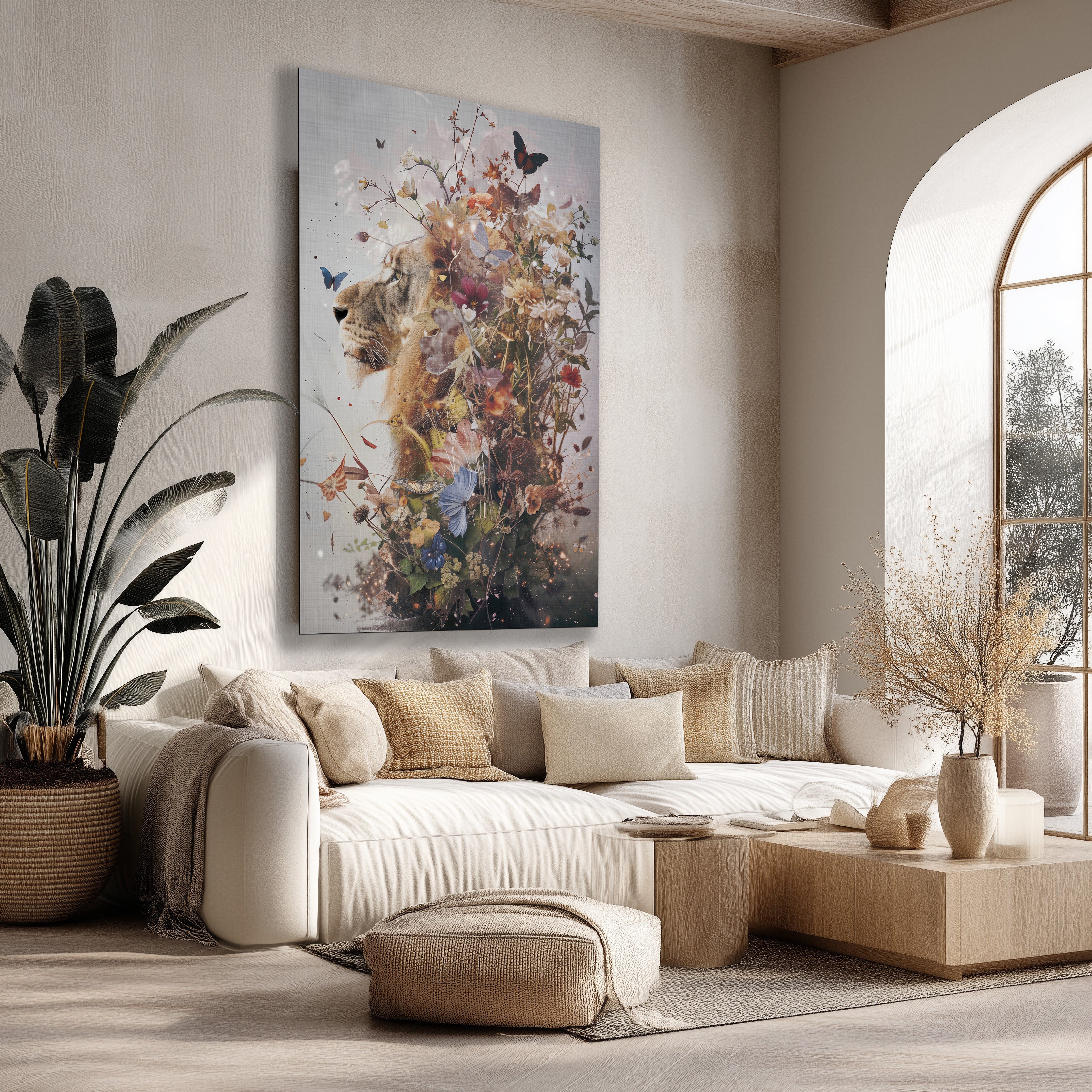 Floral Lion brengt een krachtige en serene sfeer in je interieur met een uniek combinatie van jungle en botanische elementen. Dit staande kunstwerk versterkt elke ruimte met een stijlvol en levendig accent.