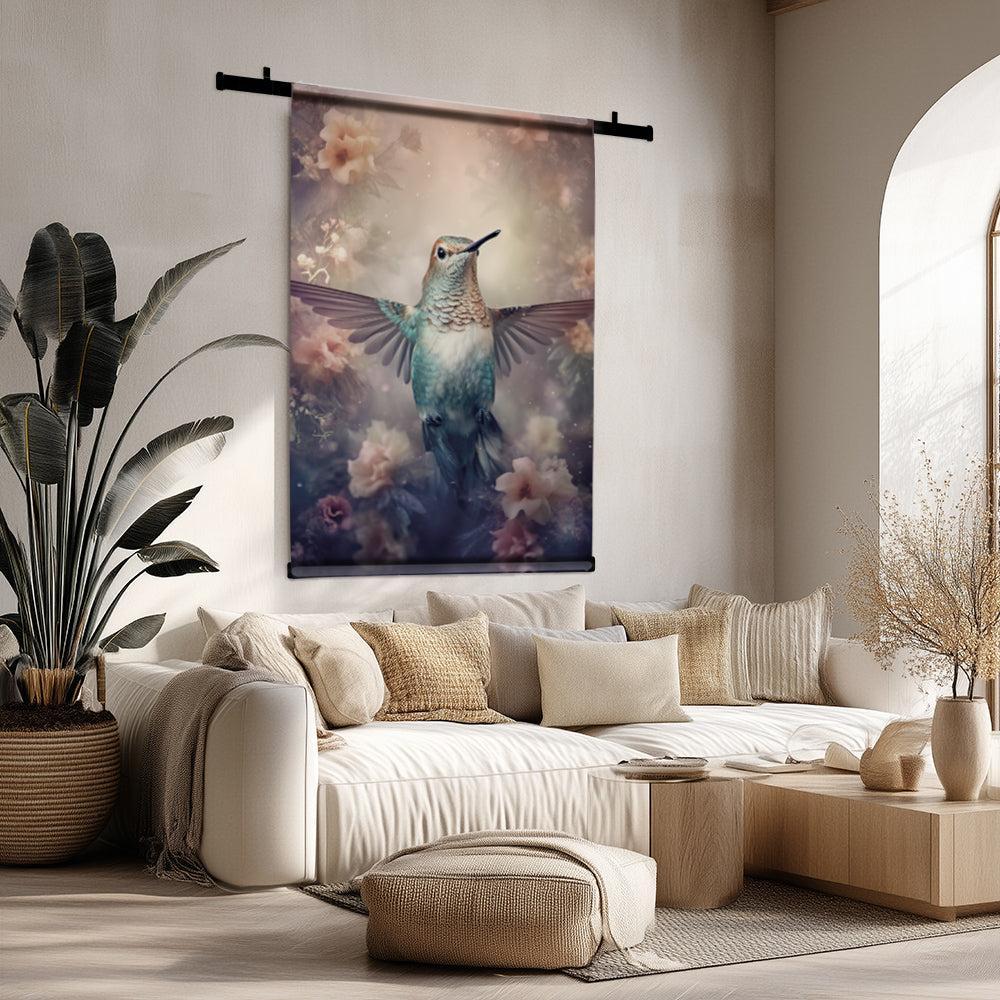 Dit stijlvolle wandkleed brengt leven met een verfijnde afbeelding van een kolibrie tussen bloemen, die warmte en charme toevoegt aan woonkamer, slaapkamer of werkplek. De keuze uit Mezo – een robuuste matte stof met een natuurlijke uitstraling – of Velours – een luxe stof met subtiele zijdeglans – maakt het eenvoudig om het perfect aan te passen aan jouw interieur. Dit unieke kunstwerk past moeiteloos in woonstijlen zoals landelijk, bohemian, scandinavisch en zen/japandi, en geeft een sfeervol en visueel interessant muuraccent. De botanische kleuren en texturen versterken de rustgevende ambiance van je interieur zonder te overheersen.
