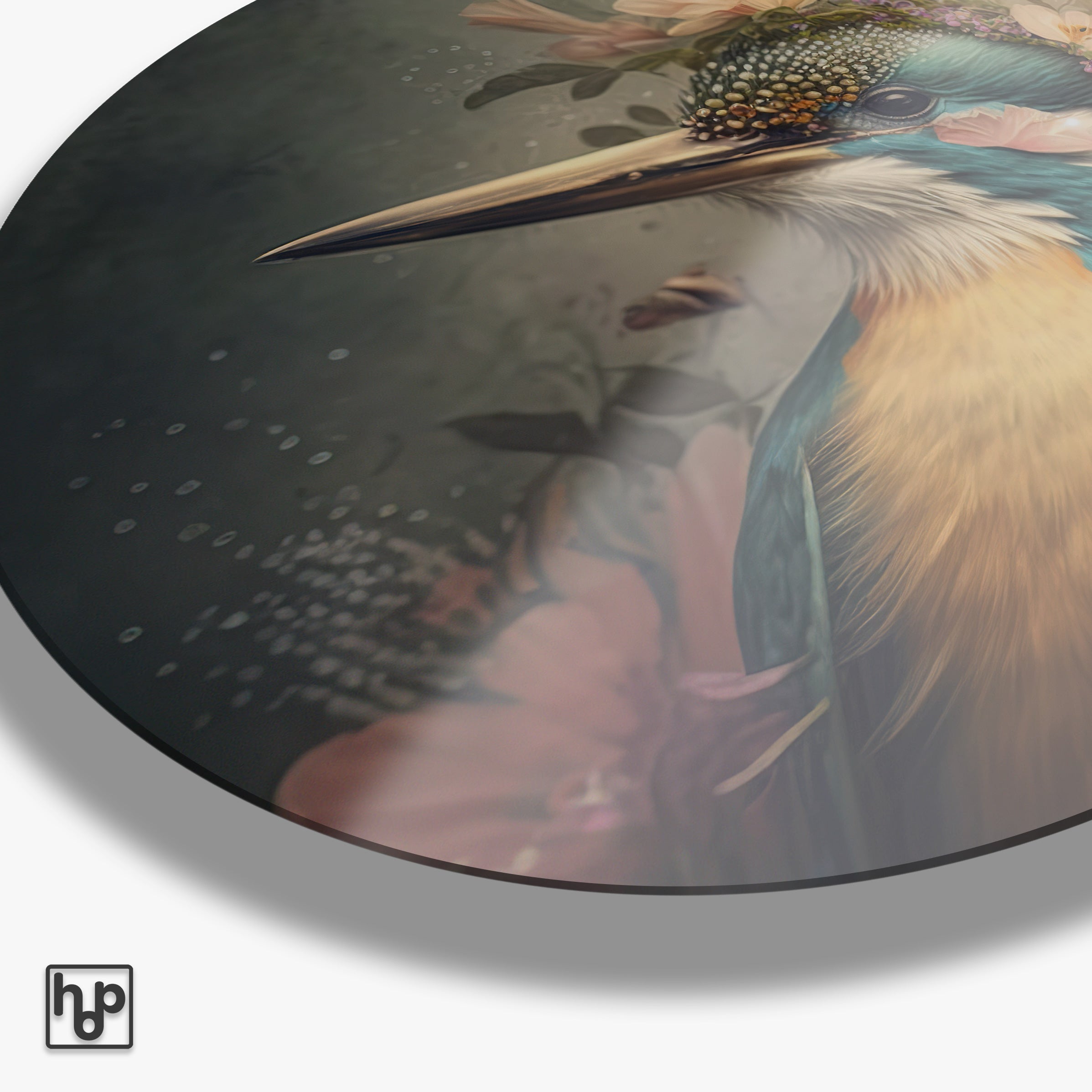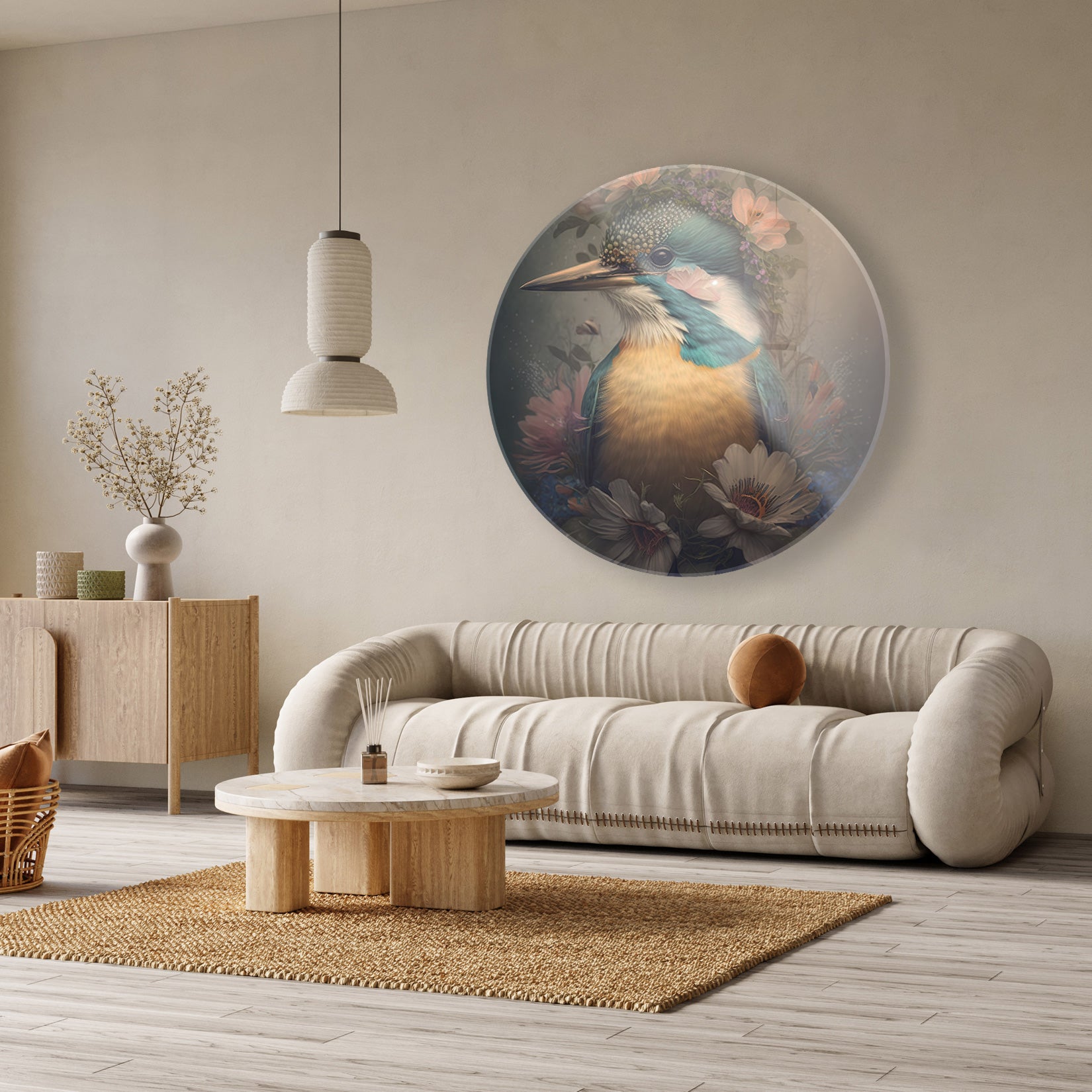 Deze muurcirkel met het design Kingfisher 6 straalt rust en natuur uit. Het realistische detail van de ijsvogel, omringd door zachte bloemen, brengt een serene en elegante sfeer in elke ruimte. Het plexiglas accentueert het ontwerp met een subtiele glans, waardoor het kunstwerk echt tot leven komt aan jouw muur. Perfect om bijvoorbeeld in de woonkamer of slaapkamer een natuurlijke touch toe te voegen.