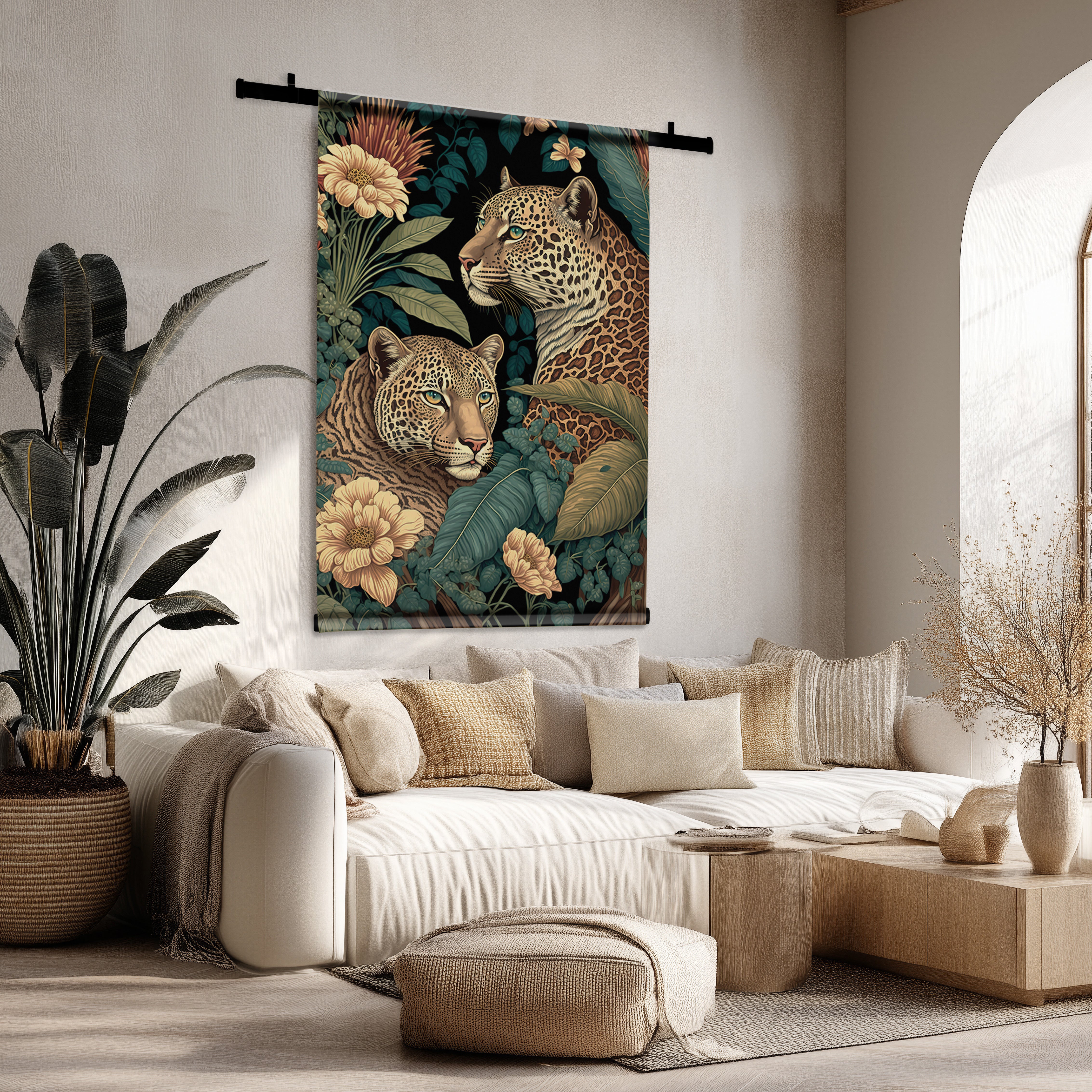 Ervaar de krachtige uitstraling van de natuur in je interieur met het wandkleed Leopards. Dit stijlvolle muuraccent brengt een vleugje wilde elegantie en mysterie in je leefruimte, perfect om thuis te ontspannen en geïnspireerd te raken.