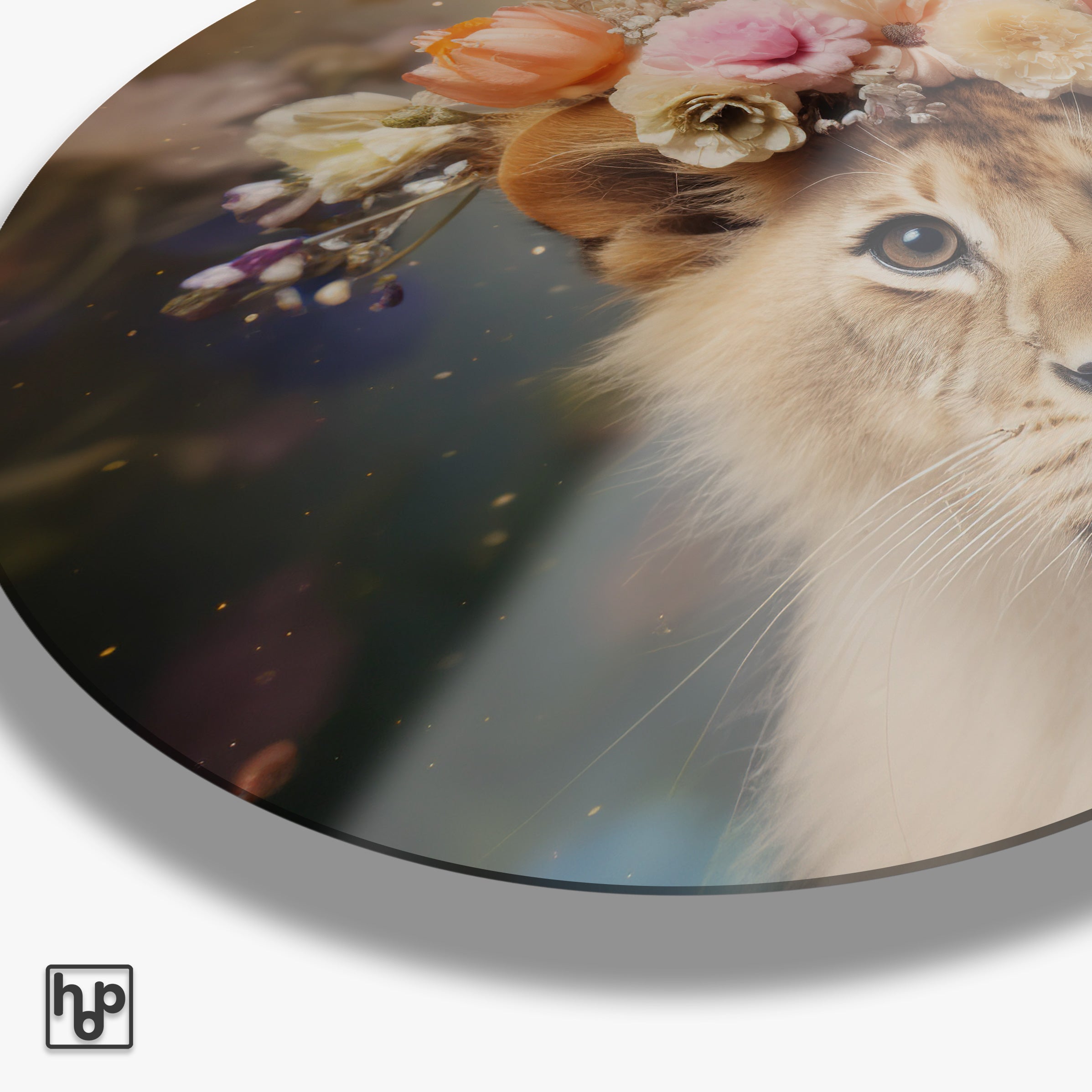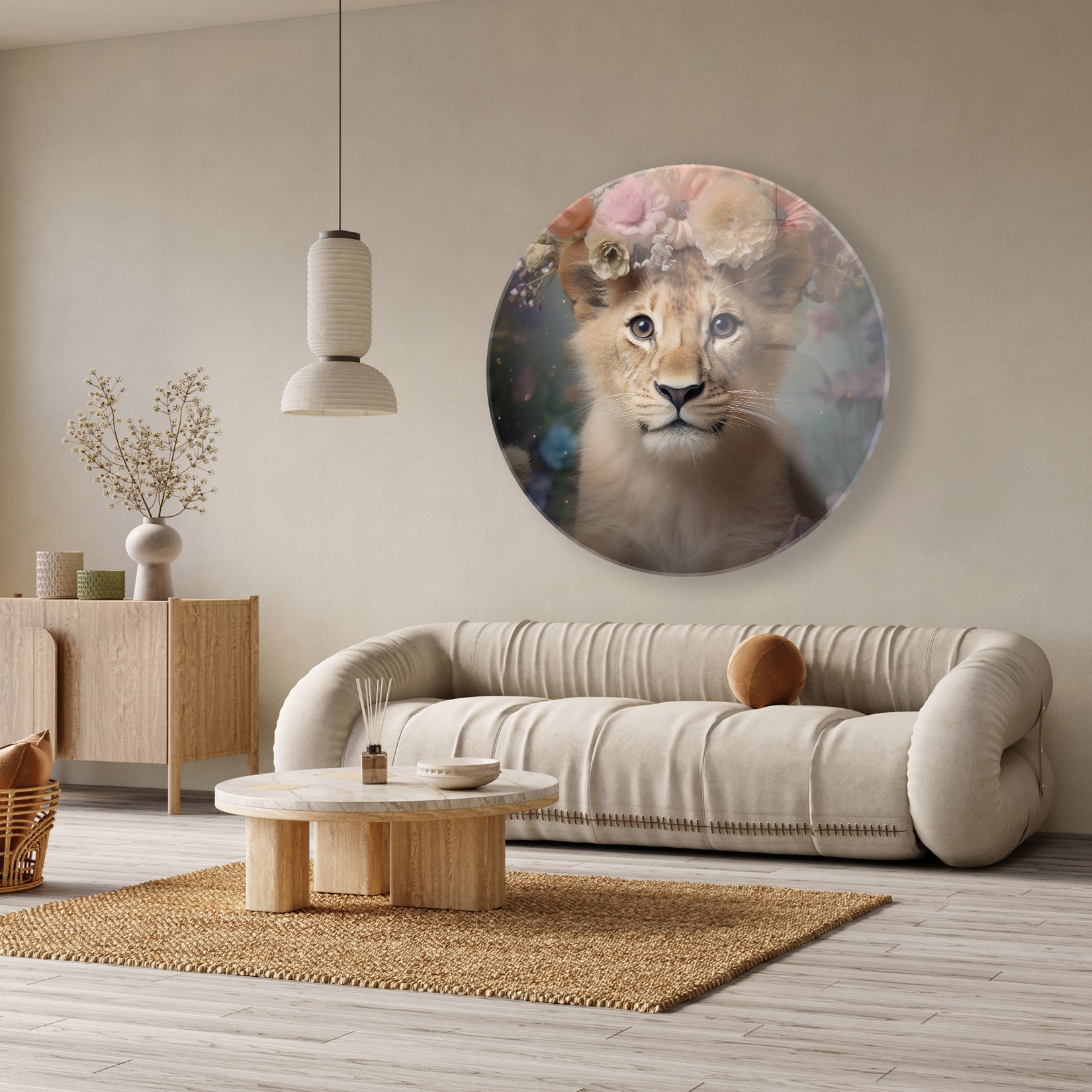Deze muurcirkel met het ontwerp van een jonge leeuw straalt een natuurlijke en serene sfeer uit. Het zachte licht dat op de vacht en bloemen valt, maakt dit plexiglas schilderij perfect voor moderne interieurs. Stel het je voor aan de muur van je woonkamer, slaapkamer of zelfs kantoor, waar het een kalme en inspirerende ambiance creëert. De harmonieuze kleuren en het realistische beeld brengen een stukje natuurverfijning naar binnen.