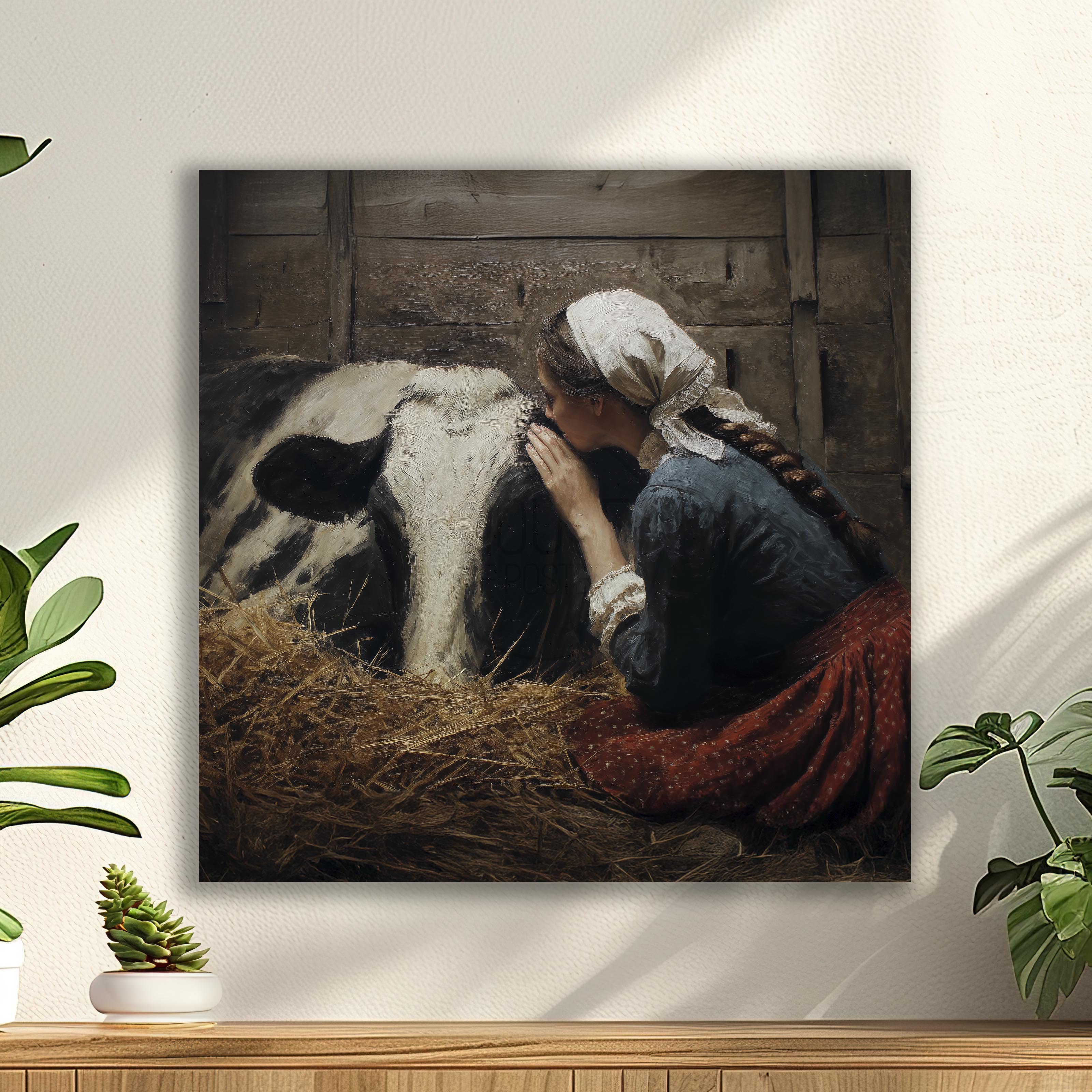 De levendige muurkunst met het indrukwekkende portret van deze karakteristieke koe en een meisje verrijkt zowel de woonkamer als de slaapkamer. Door het warme kleurenpalet en het unieke dierenthema ontstaat een stijlvol muuraccent dat direct aandacht trekt en sfeer toevoegt. Dit kunstwerk geeft je interieur een landelijke en toch eigentijdse uitstraling.