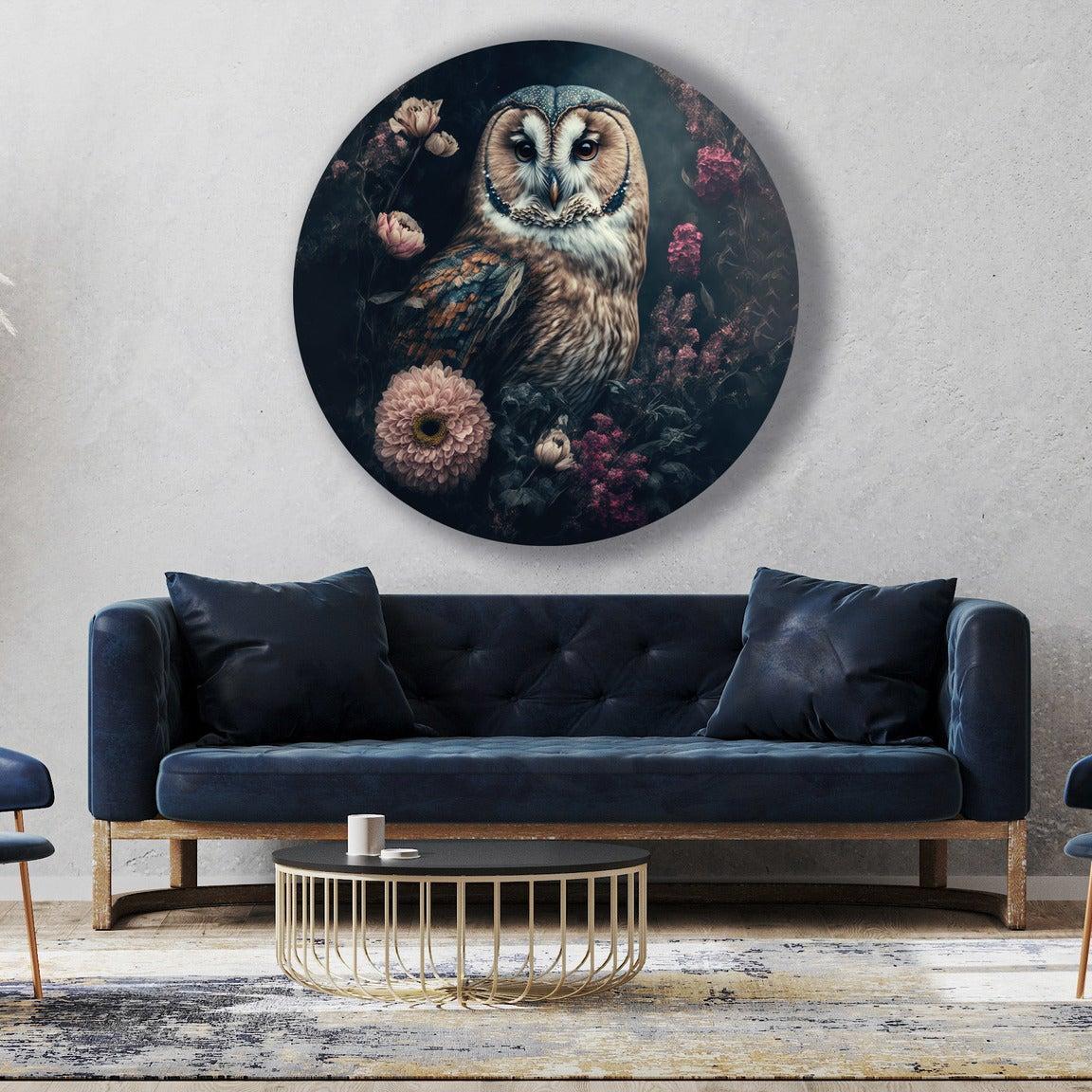 Deze muurcirkel straalt een rustige en mysterieuze sfeer uit die elke ruimte direct verrijkt met een natuurlijk en speels accent. Het krachtige silhouet van een uil, omlijst door botanische details, zorgt voor een uniek ontwerp dat jouw interieur karakter geeft.