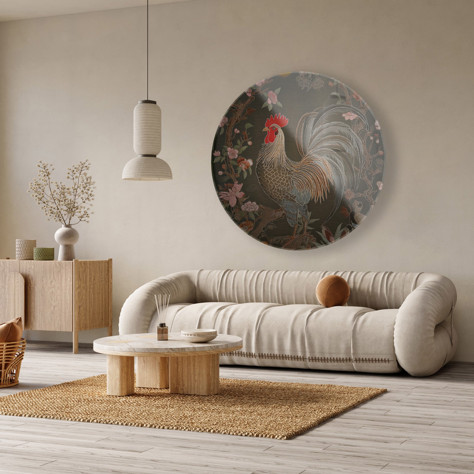 Deze muurcirkel met het ontwerp Rooster straalt een klassieke en sfeervolle uitstraling uit. Het gedetailleerde haan-motief komt prachtig tot leven door de rijke kleuren en het natuurlijke thema. Deze plexiglas wanddecoratie past perfect in een stijlvolle woonkamer of een rustige slaapkamer, waar het een warm en karaktervol accent aan de muur toevoegt.