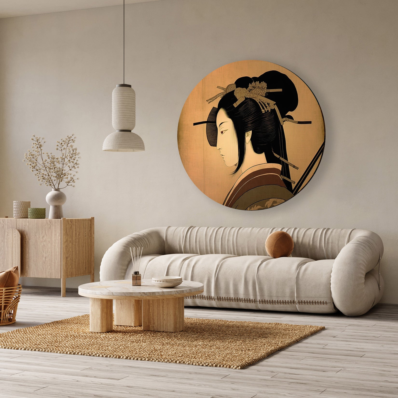 Deze muurcirkel van aluminium dibond met het ontwerp Samurai ademt een tijdloze en serene sfeer. Het kunstwerk toont een klassieke Japanse stijl met subtiele, naturelle kleuren, die perfect tot hun recht komen in een moderne woonkamer of een rustige slaapkamer. Door het verfijnde profiel en de ronde vorm creëert deze aluminium wanddecoratie een stijlvolle en harmonieuze uitstraling die elke ruimte elegant versterkt.