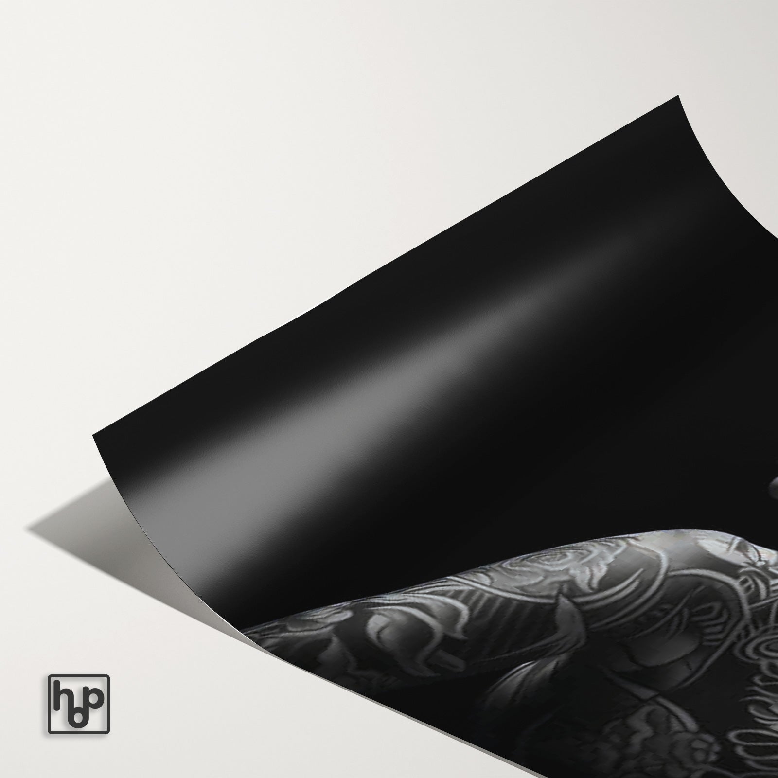 Breng een krachtige en rustige sfeer in je interieur met deze elegante zwart-wit poster. Dit liggende portret van een vrouw met tatoeages geeft je muur een expressief en stijlvol accent dat direct opvalt.